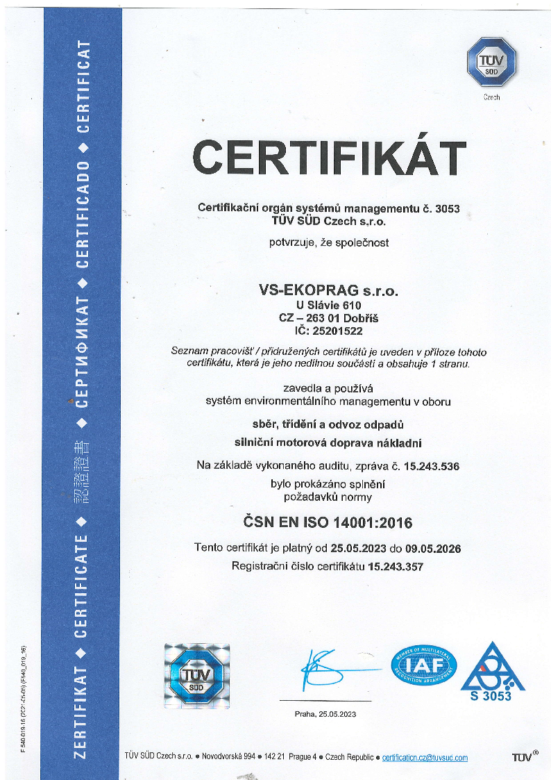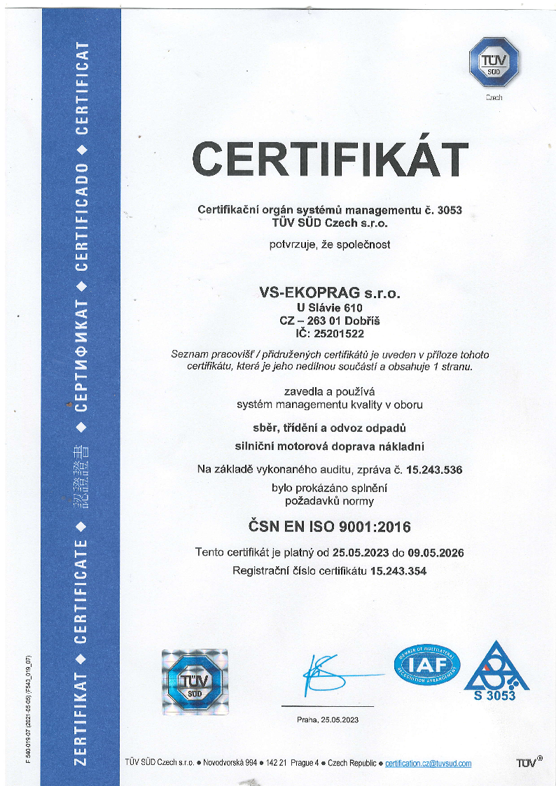 Společnost VS-Ekoprag s.r.o. se řídí firemní politikou jakosti podle ISO 9001:2016 a politikou ochrany životního prostředí dle ISO 14001:2016.